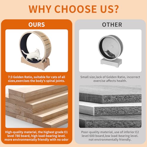 【High Quality Materials & Mute Design】Cat Exercise Wheel is made of carefully selected solid wood multi-layer craft board, the Cat Treadmill is very durable, made of wood, and the large and sturdy rotating wheel is enough to provide space for running. The Cat Running Wheel lower shaft adopts the mute pulley design, can effectively prevent noise. When your cat is exercising, you can still listen to music quietly by the side.